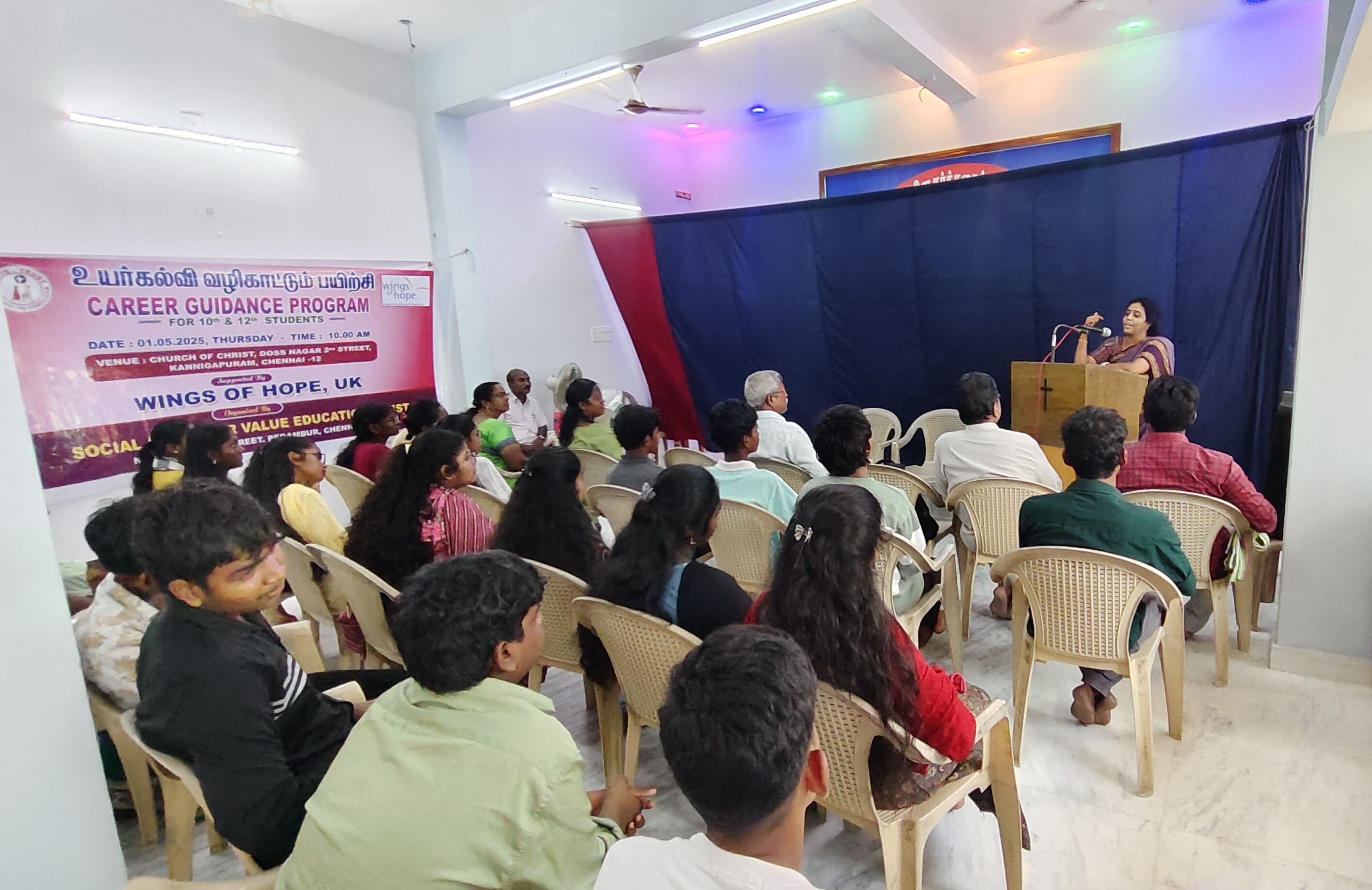 Since 2003, SAVE Trust has conducted annual counselling for 10th, 11th, and 12th standard students from low-income families, focusing on study skills, goal setting, and avoiding negative influences. Held from January to March, over 50,000 students from Chennai and surrounding areas have benefited. On May 1, 2025, a Career Guidance event in Kannigapuram featured speakers including professors, engineers, and medical professionals who inspired students to explore various academic and career paths. Students expressed gratitude for the guidance, and SAVE Trust reaffirmed its commitment to ongoing support with help from The Wings of Hope, UK.